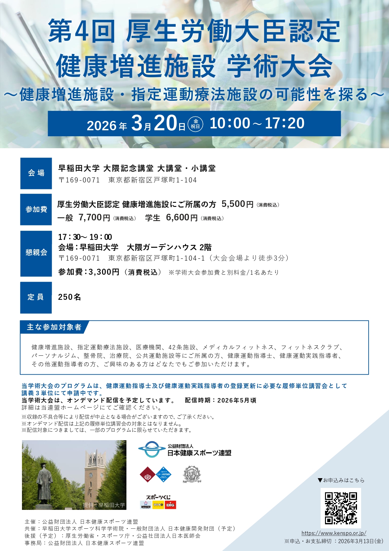 【第4回厚生労働大臣認定 健康増進施設 学術大会】参加申込受付 開始しました!!